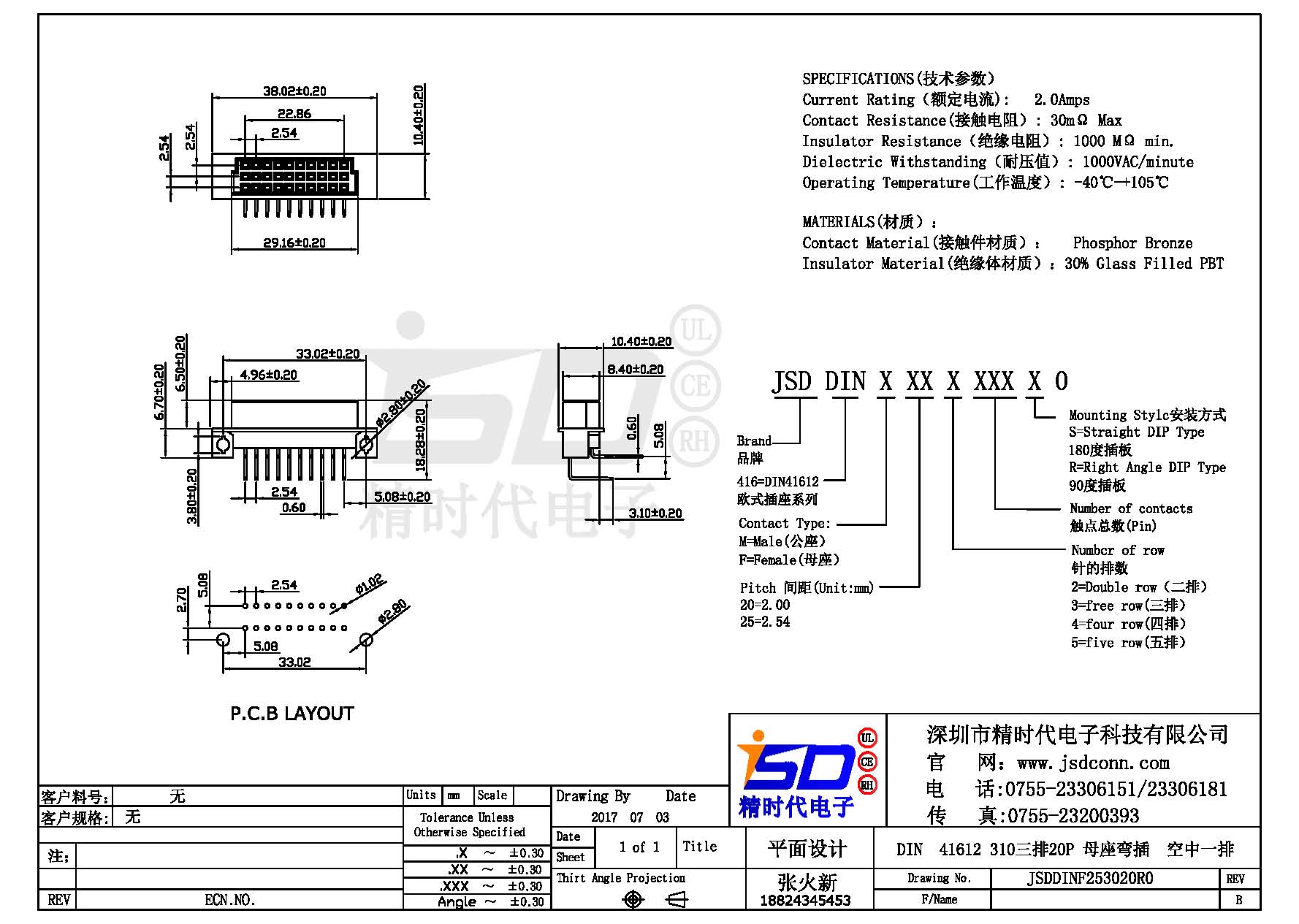 DIN 41612 Connectors Female  Pitch:2.54mm 20 PIN (Triple Row)Right Angle DIP Solder sample