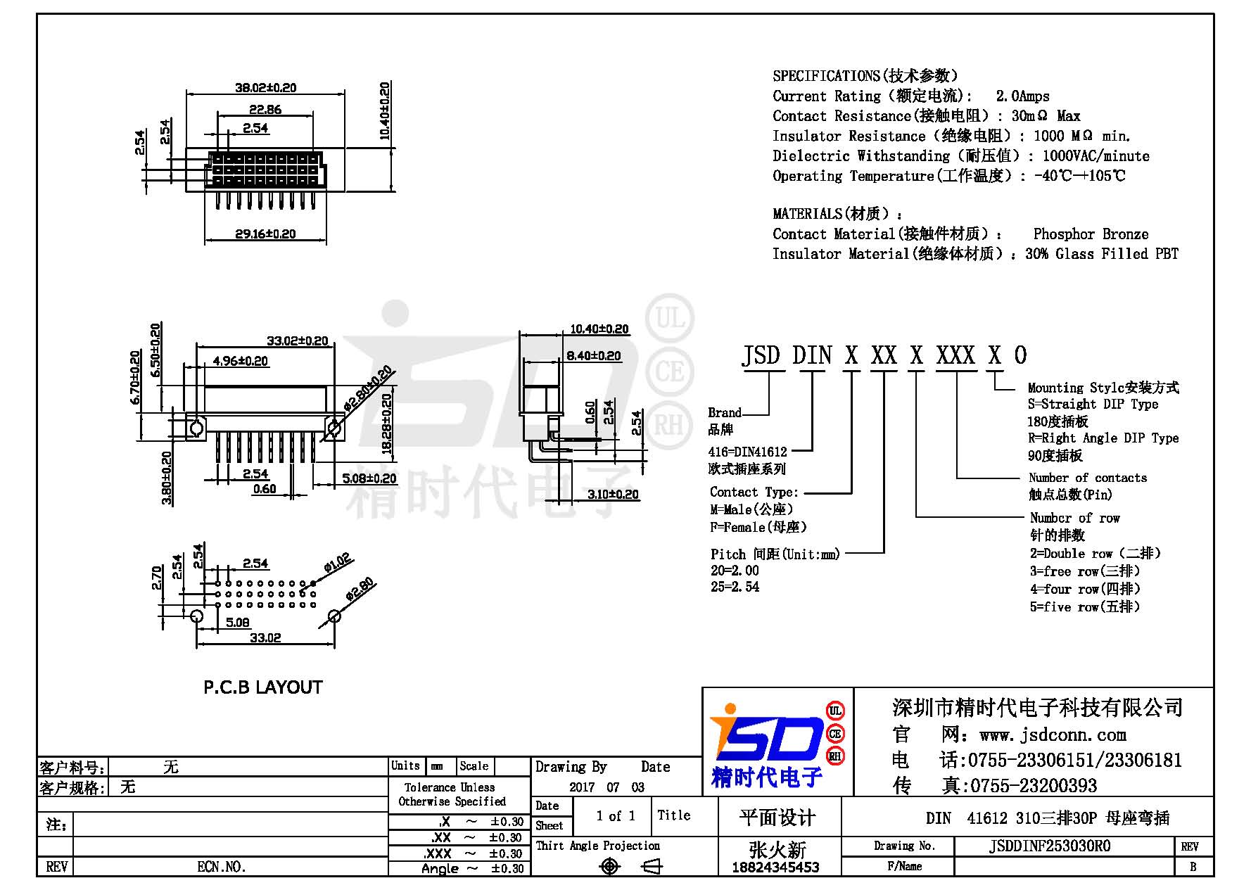 DIN 41612 Connectors Female  Pitch:2.54mm 30 PIN (Triple Row)Right Angle DIP Solder sample