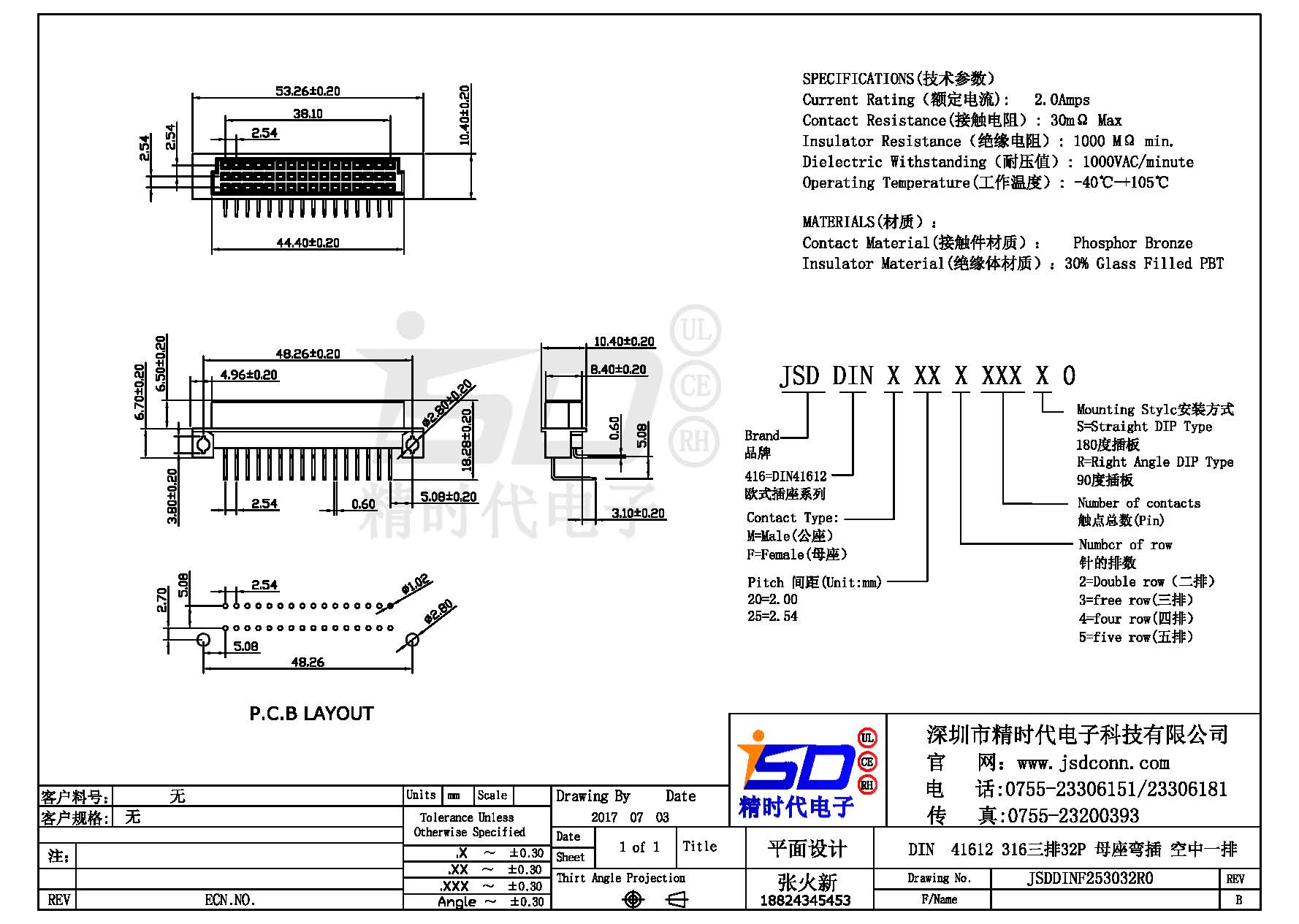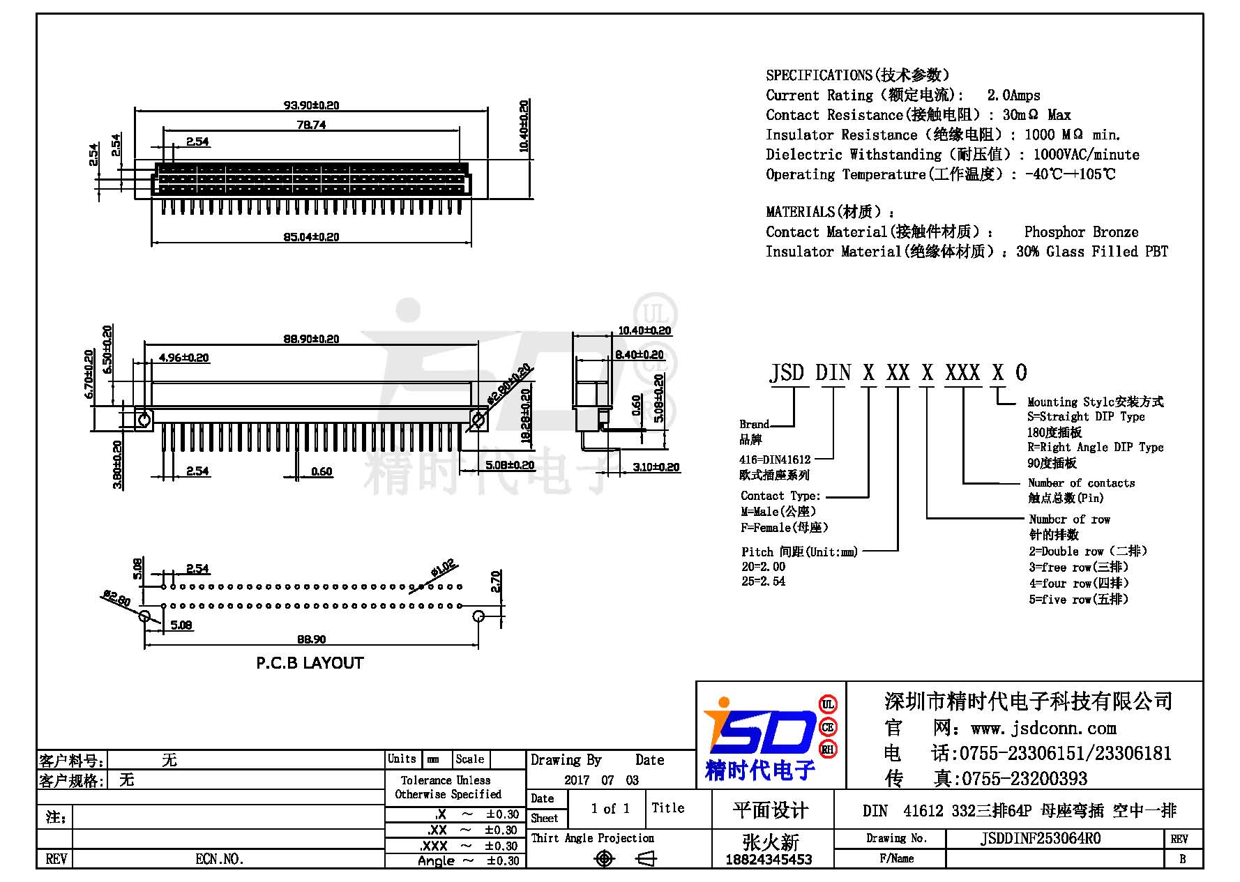 DIN 41612 Connectors Female  Pitch:2.54mm 32 PIN (Triple Row)Right Angle DIP Solder sample