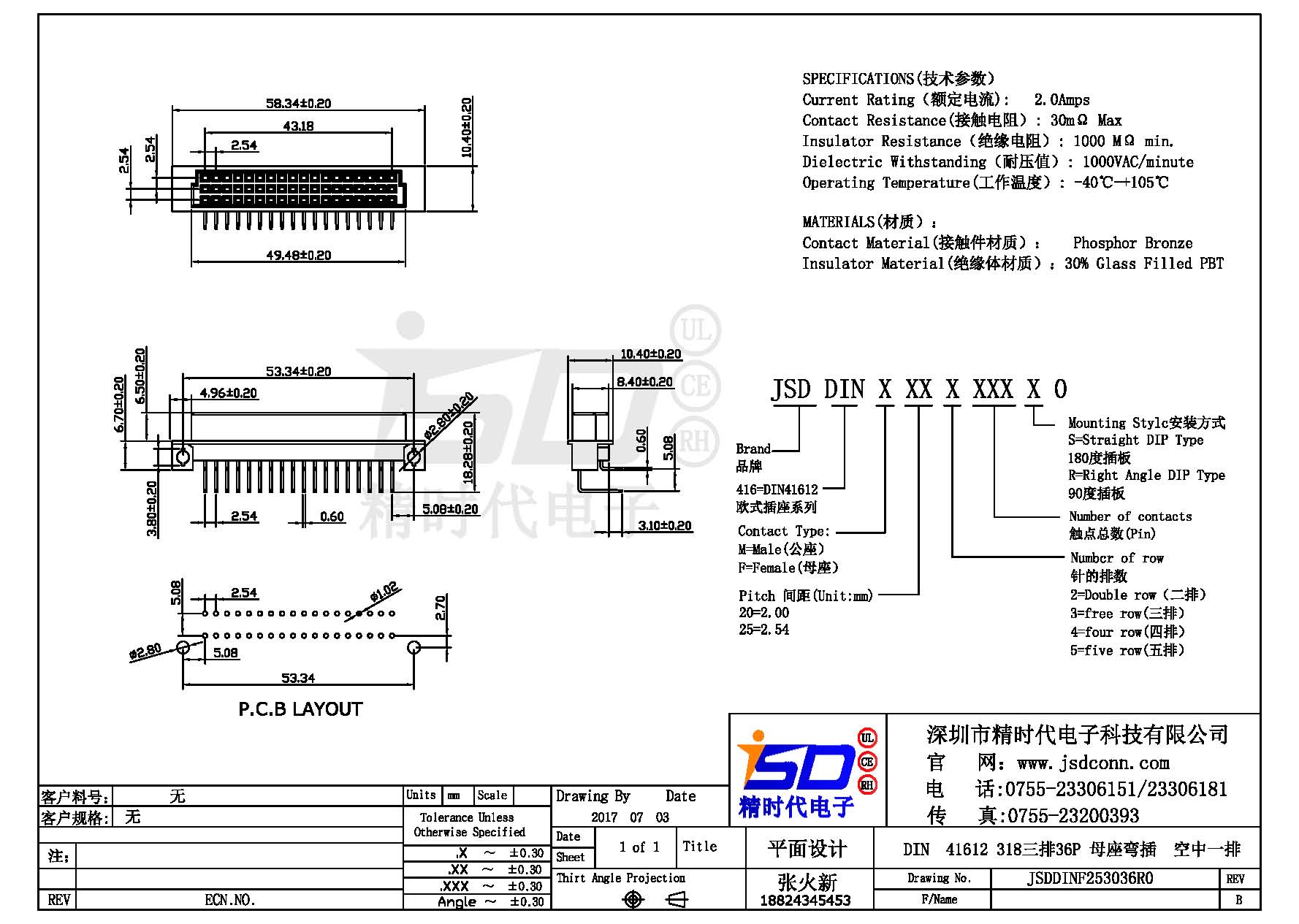 DIN 41612 Connectors Female  Pitch:2.54mm 36 PIN (Triple Row)Right Angle DIP Solder sample