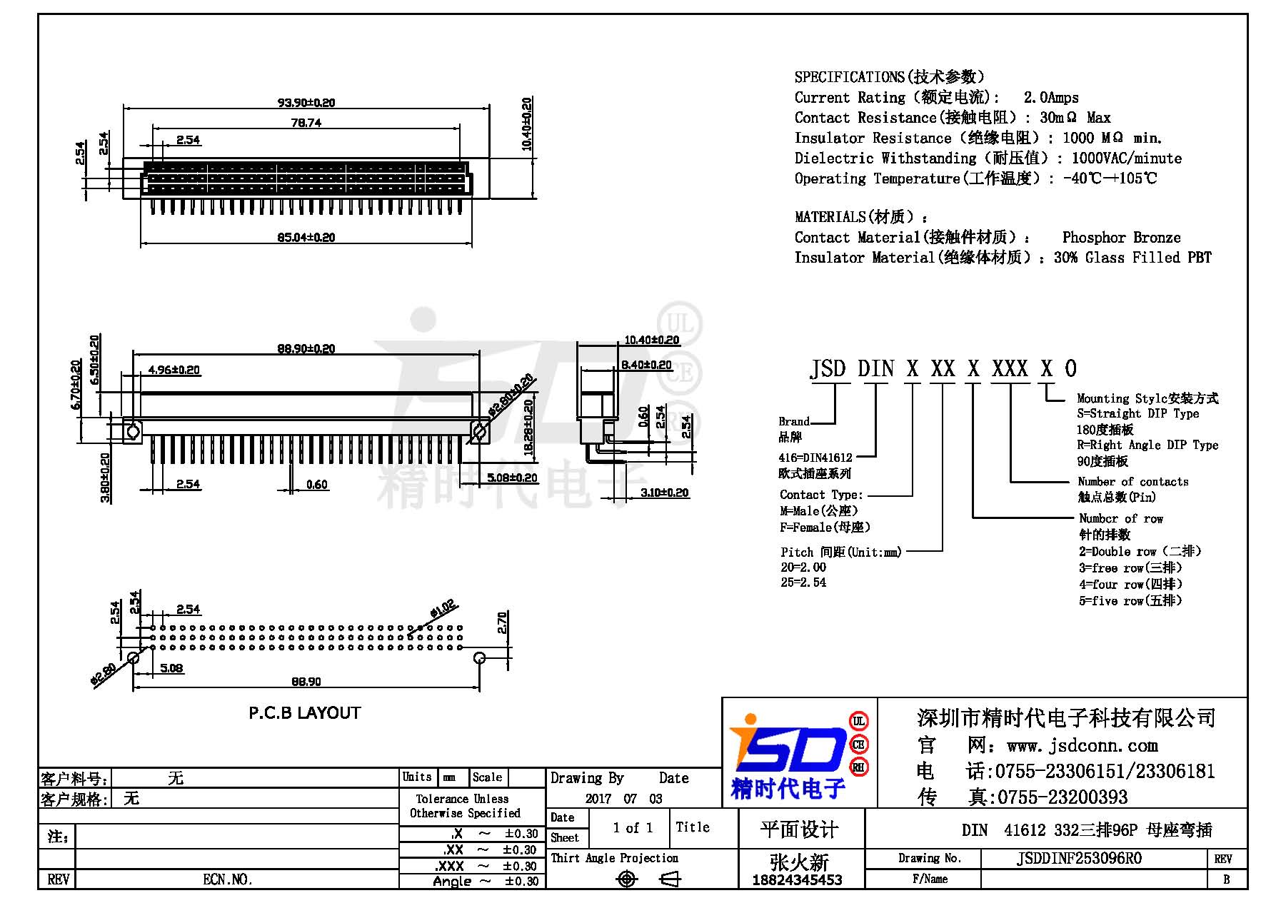 DIN 41612 Connectors Female  Pitch:2.54mm 96 PIN (Triple Row)Right Angle DIP Solder sample