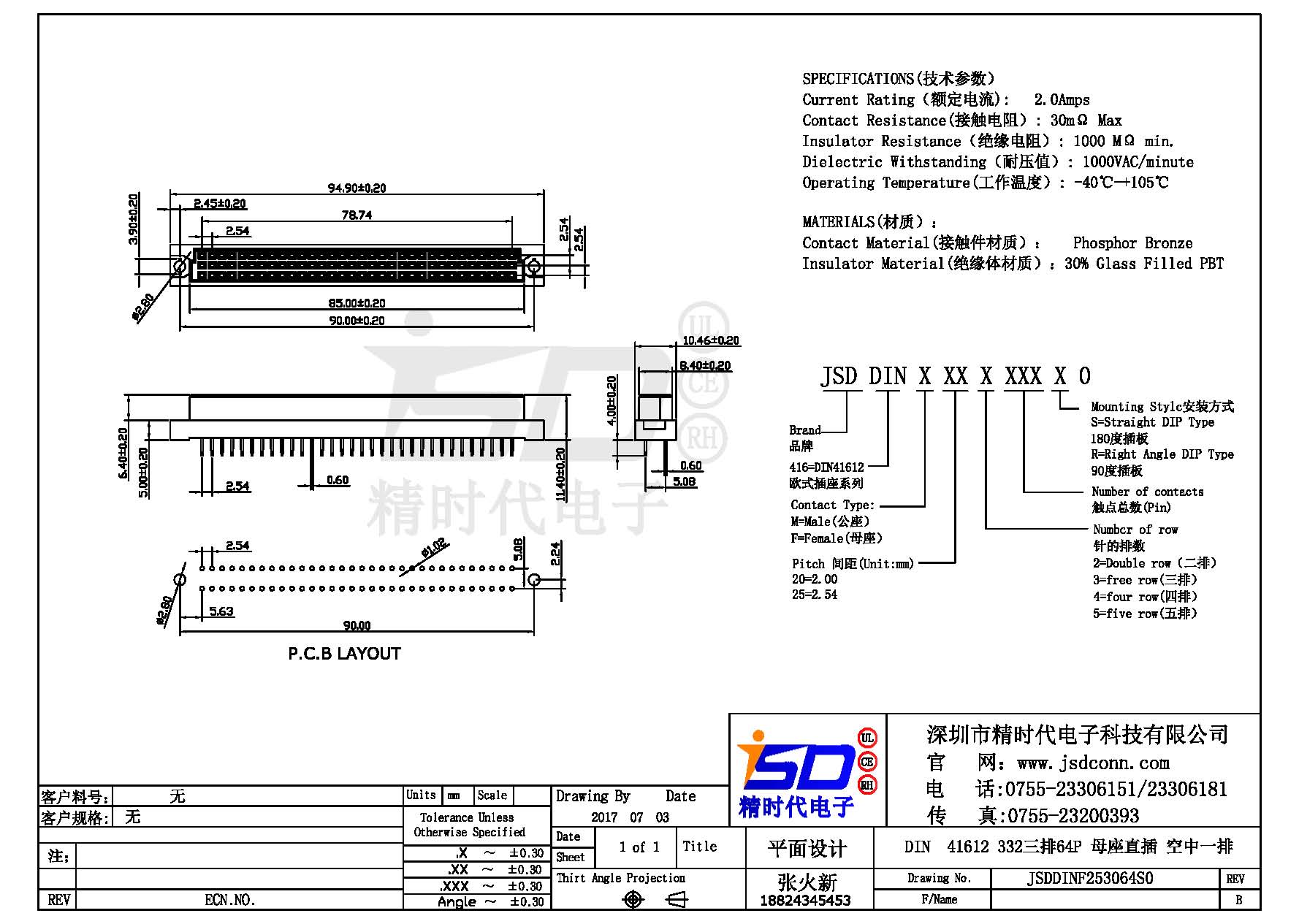 DIN 41612 Connectors Female Pitch:2.54mm 64 PIN (Triple Row)Straight DIP Solder sample